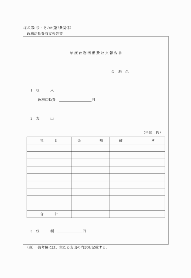 第7条 政務活動費の交付を受けた会派の経理責任者は、様式第1号(その1、その2)により、領収書又はこれに準ずる書類を添付して政務活動費に係る収入及び支出の報告書(以下「収支報告書」という。)を作成し、議長に提出しなければならない。