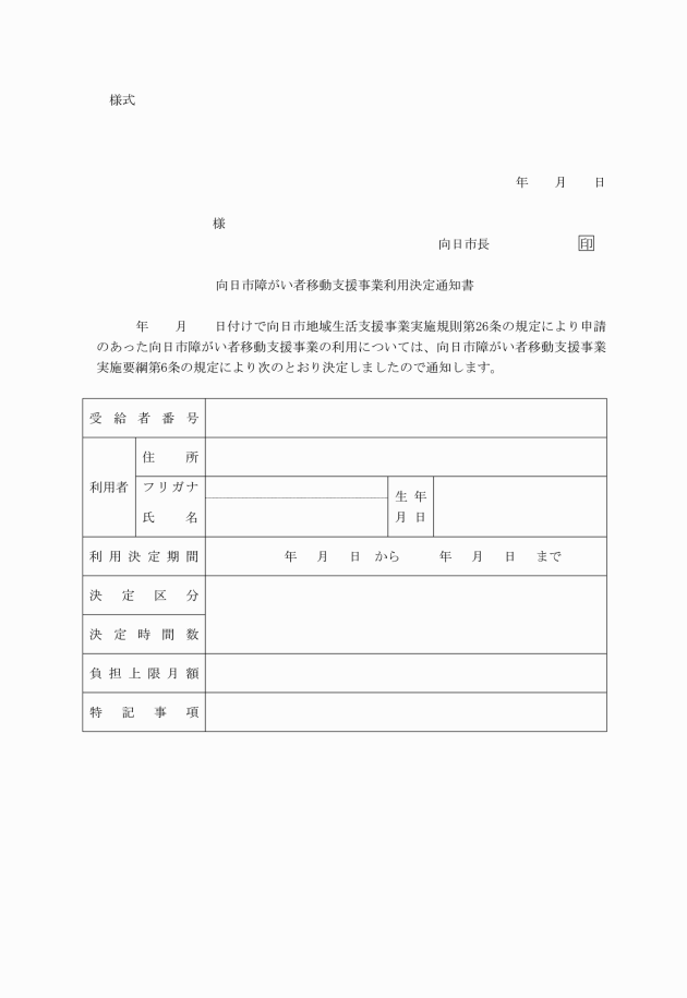 第1条 この要綱は、向日市地域生活支援事業実施規則(平成18年規則第42号。以下「規則」という。)第2条第1項第10号の移動支援事業の実施に関し、必要な事項を定めるものとする。