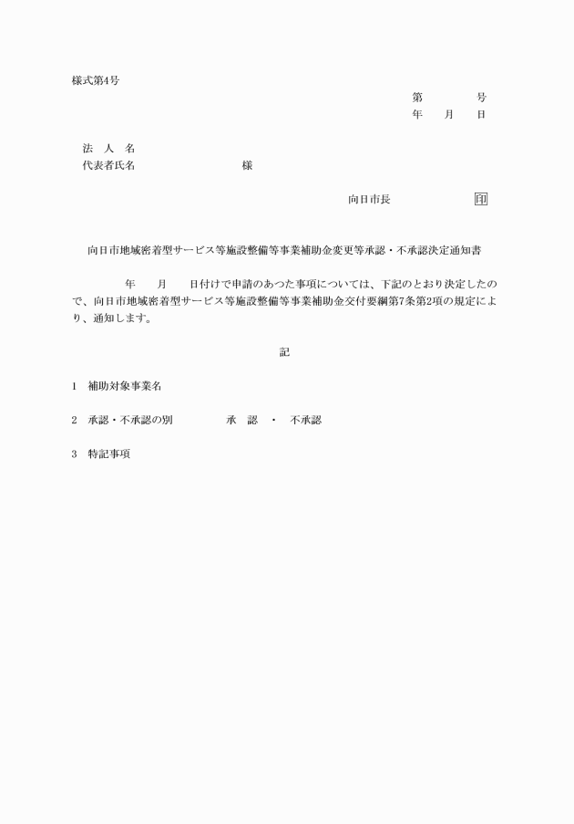 第7条 補助金の交付の決定を受けた者(以下「補助事業者」という。)が補助事業の内容、経費の配分その他申請に係る事項(以下「内容等」という。)を変更(軽微な変更を除く。)する場合又は補助事業を中止する場合は、向日市地域密着型サービス等施設整備等事業補助金変更等承認申請書(様式第3号)に、次に掲げる書類を添えて市長に提出しなければならない。