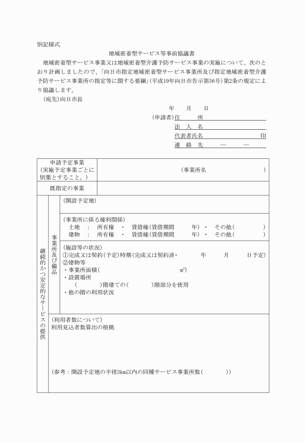 第2条 指定地域密着型サービス事業又は指定地域密着型介護予防サービス事業に係る事業者の指定を受けようとする者(以下「事業予定者」という。)は、介護保険法(平成9年法律第123号。以下「法」という。)第78条の2第4項若しくは第6項又は第115条の12第2項若しくは第4項に該当しないことを明らかにするため、あらかじめ地域密着型サービス等事前協議書(別記様式)に次に掲げる書類を添えて市長に提出し、事前協議を行わなければならない。