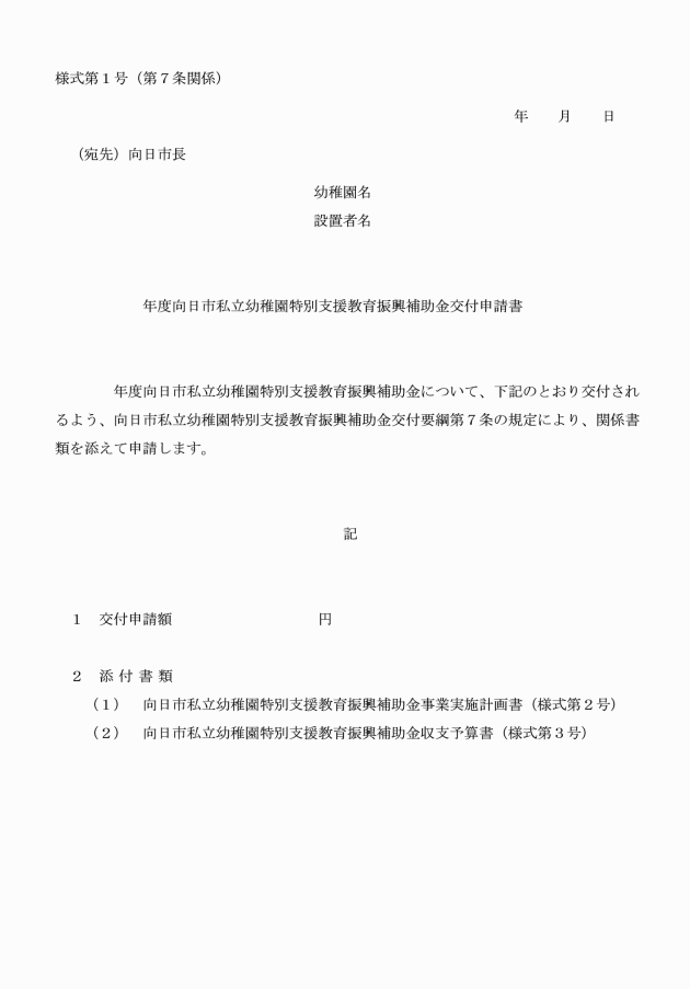 第7条 補助金の交付を受けようとする私立幼稚園の設置者は、向日市私立幼稚園特別支援教育振興補助金交付申請書(様式第1号)に次に掲げる書類を添えて、別に定める期日までに市長に提出しなければならない。