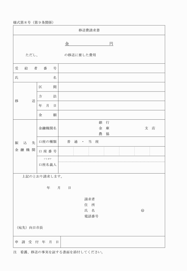 第9条 移送費の支給を受けようとする受給者は、移送承認申請書(様式第6号)を市長に提出しなければならない。