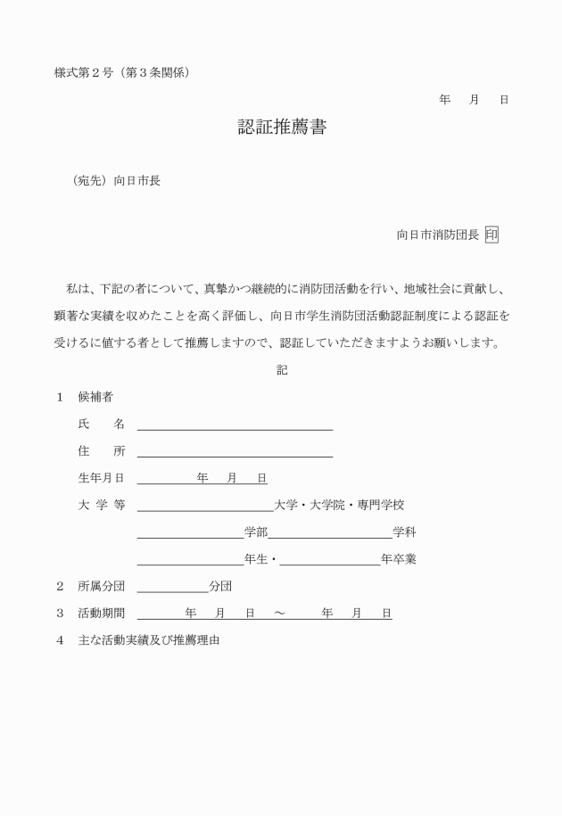 第3条 本制度による認証を希望する認証対象団員は、消防団長に認証推薦依頼書(様式第1号)を提出するものとする。