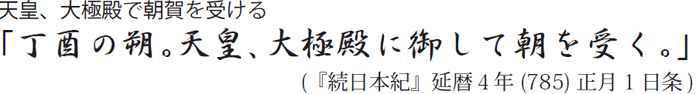 長岡京に遷都してはじめて迎える新年。元旦の朝賀の儀式がおこなわれるようすを大極殿背後の上空から望む。